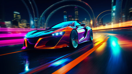 A futuristic car is driving down a road with bright lights and neon colors. The car is sleek and modern, and it seems to be moving at a high speed. The scene is dynamic and energetic