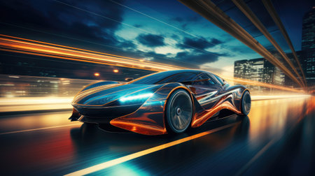 Futuristic Car Racing at High Speed in the Night with Motion Blur. Perfect for Posters and Landing Pages. Generative AI