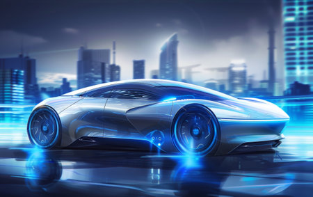 A sleek futuristic car speeding through a neon-lit cityscape at night, emphasizing cutting-edge technology and innovative automotive design