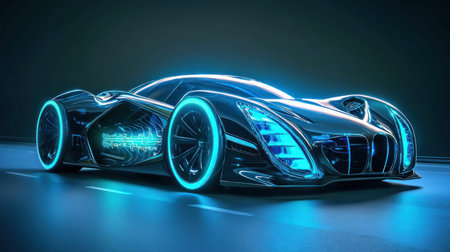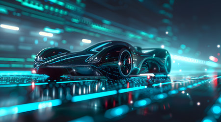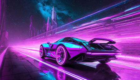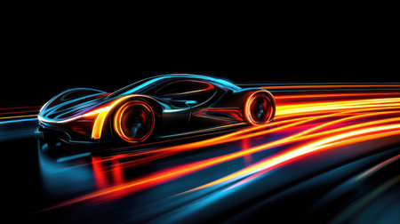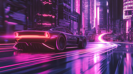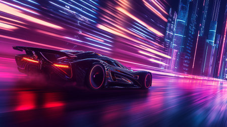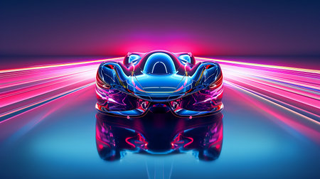 A stunning representation of a futuristic sports car set against a dark background, showcasing vibrant neon lights. The design emphasizes speed and elegance, evoking a sense of power and advanced technology. Perfect for automotive-themed projects.
