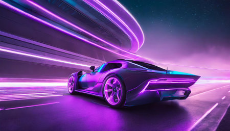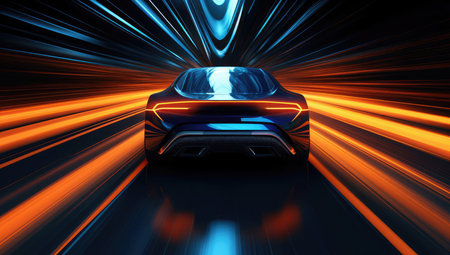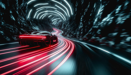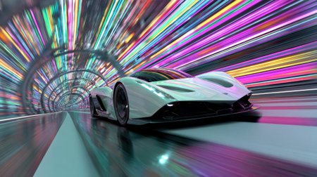 A futuristic car racing through neon lit tunnel, showcasing bold innovation and sleek design