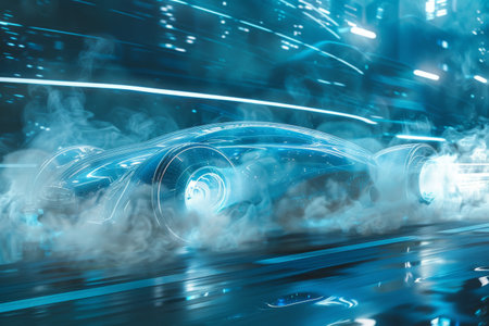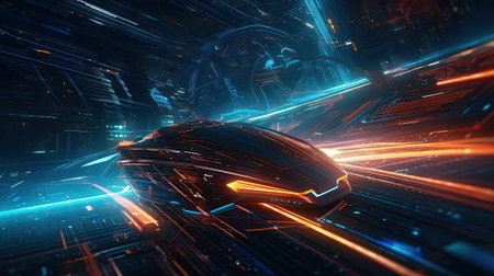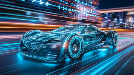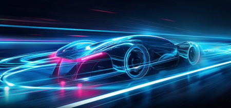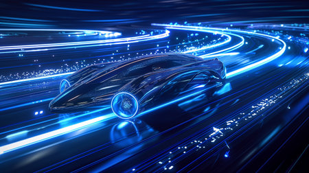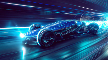 A sleek, futuristic car speeds along a neon-lit track, surrounded by glowing blue light trails, creating a dynamic and high-tech atmosphere.