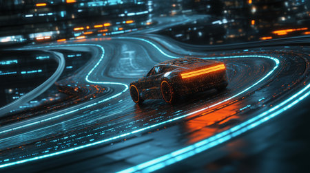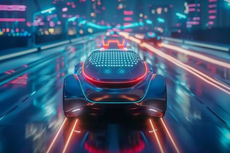 Conceptual image of a sleek futuristic vehicle on a neon-lit cybernetic highway at night