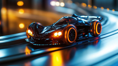 A futuristic toy car with glowing lights, placed on a sleek silver track under dramatic lighting