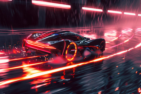 A car is driving on a wet road with red lights in the background. The car is a sports car with a neon light on the front. Scene is exciting and fast-paced