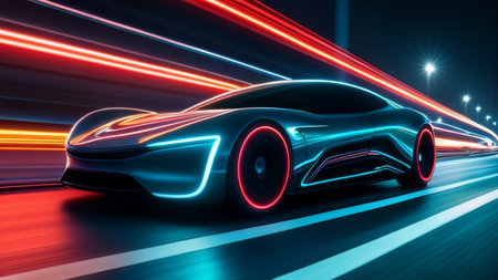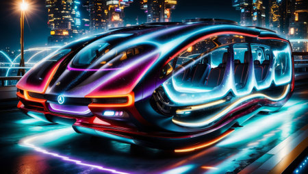 A stunning, futuristic electric car design with vibrant neon lights, showcasing a sleek and modern aesthetic. Perfect for technology and automotive themes.