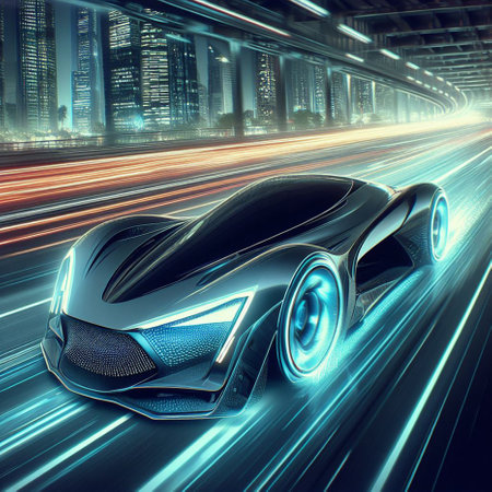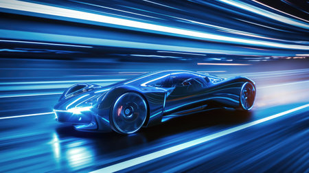 A sleek, futuristic car speeds through a tunnel of neon blue lights, creating a sense of high velocity and advanced technology.