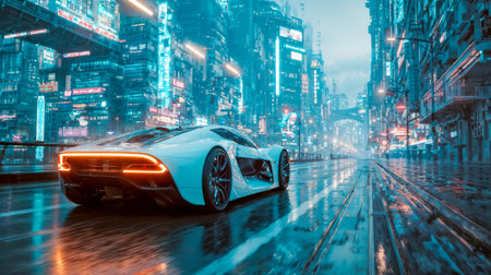 A stunning, futuristic car with illuminated wheels parked on a rain-soaked street, surrounded by a dynamic city skyline.
