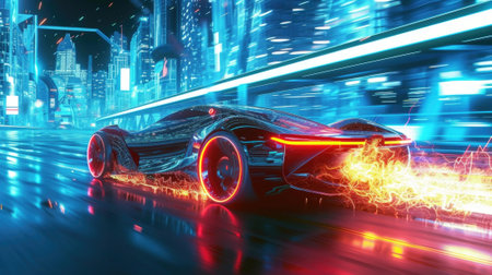 A futuristic sports car speeding across a sci-fi-inspired landscape with neon light trails and motion effects