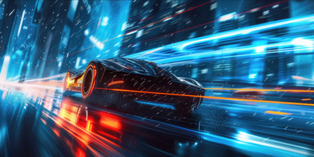 A sleek, futuristic car speeds through a neon-lit cityscape, leaving a trail of light. The scene is vibrant with blue hues and dynamic motion.