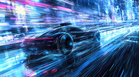 A sleek, futuristic car speeds through a neon-lit digital landscape, emitting blue light trails.