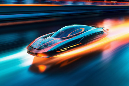 Experience a thrilling glimpse into the future where a sleek, high-speed vehicle cuts through a vibrant city illuminated by neon lights, symbolizing innovation and progress.