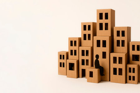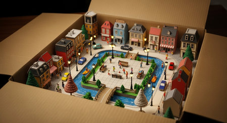 Two red miniature house in a brown box. Housing as a gift. Sale of real estate. Top view