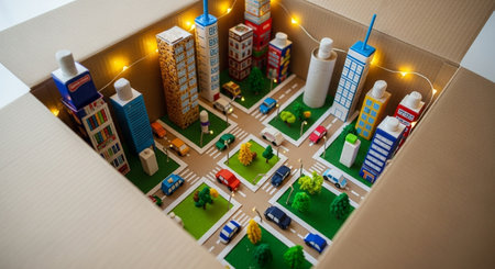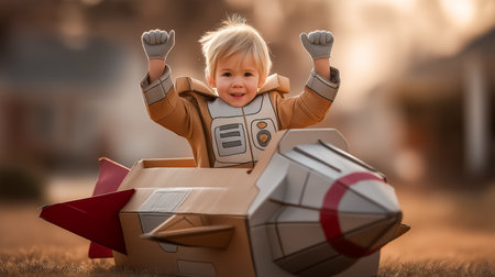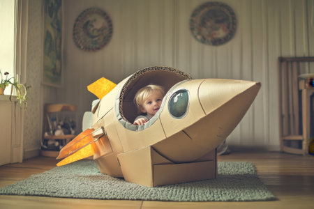 A young child enjoys imaginative play inside a handmade cardboard rocket ship, surrounded by a warm home environment.