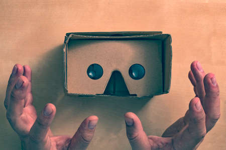 Color shot of a young woman looking through a cardboard, a device with which one can experience virtual reality on a mobile phone.