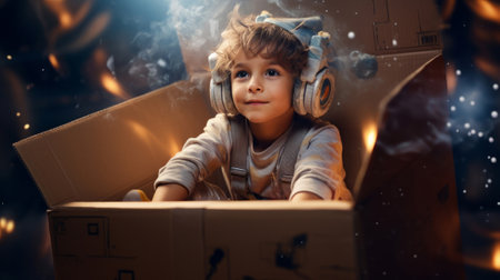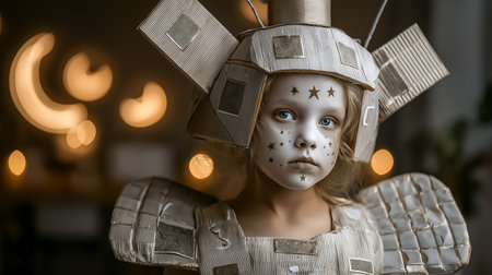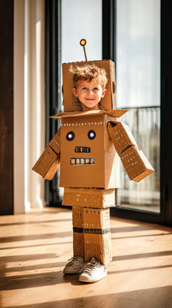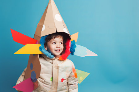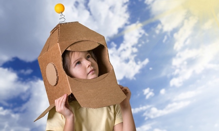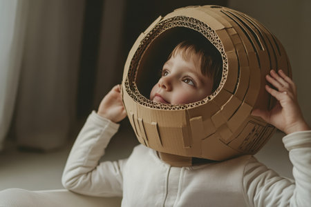 A young child dons a creatively crafted cardboard helmet, gazing upwards with a sense of wonder and imagination.