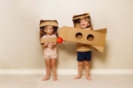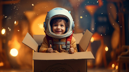 Sweet toddler boy, dressed as an astronaut, playing at home with cardboard rocket and handmade helmet from box