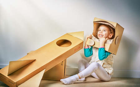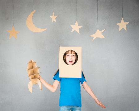 Happy child pretend to be astronaut. Funny kid playing at home. Dream and imagination concept