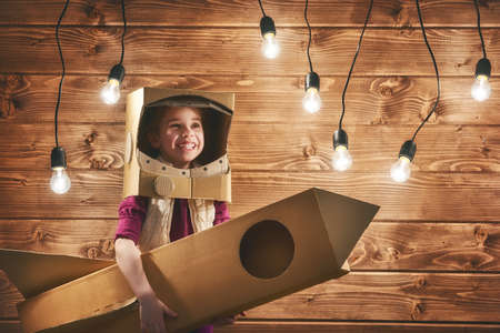Child girl in an astronaut costume with toy rocket playing and dreaming of becoming a spacemen.