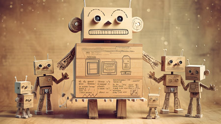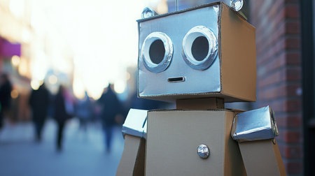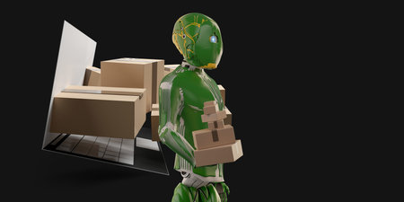 Funny robot made of cardboard boxes on dark background. 3d illustration
