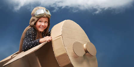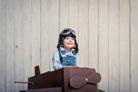 Child care. Child pilot aviator with airplane dreams of traveling.