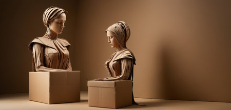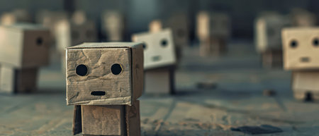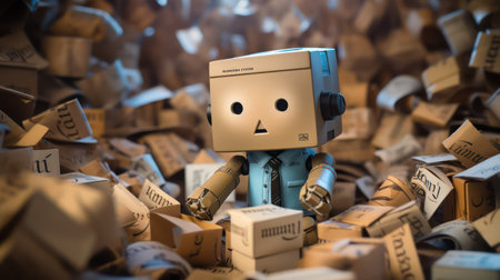 An empty cardboard box with red tape and holes under the eyes in the shape of a face is in the delivery warehouse.