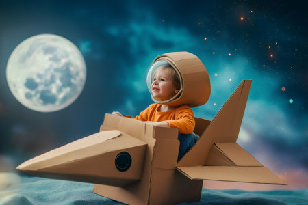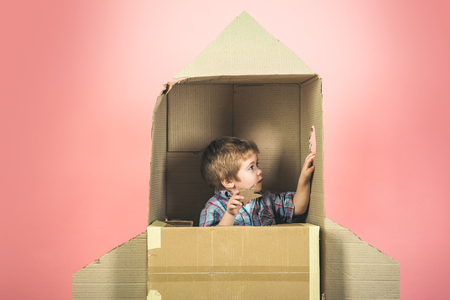 Cosmonaut concept - cute boy play cosmonaut, astronaut. Children's dreams - kid sit in cardboard space rocket dreaming becoming spacemen. Child hold star in hand, looks in illuminator cardboard rocket