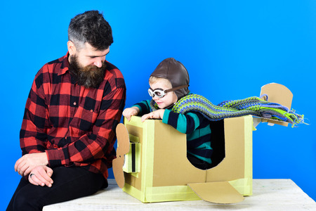 Father`s day. Happy family playing with cardboard rocket and teddy bear. Cosmonaut concept. Cute boy playing cosmonaut. Boy sit in cardboard space rocket. Parenthood concept. Child's dream. Teddy bear.