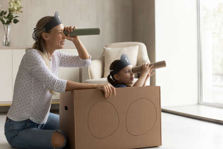 Joyful bonding young mother and little cute kid daughter looking in spyglasses, playing interesting pirates game in modern living room. Happy family having fun, entertaining together at home.