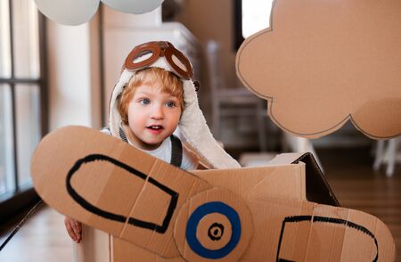 A toddler boy with carton plane playing indoors at home, flying concept.