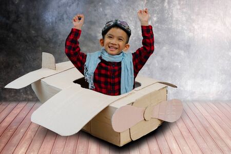 Little boy in a cardboard airplane. Child is pretending to be a pilot. Kid playing at home. Travel, freedom and imagination concept