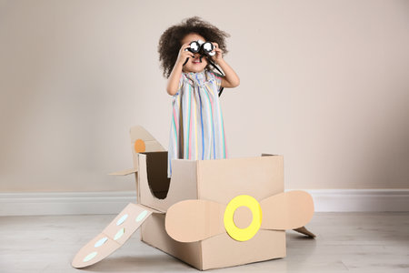 Cute African American child playing with cardboard plane and binoculars near beige wall