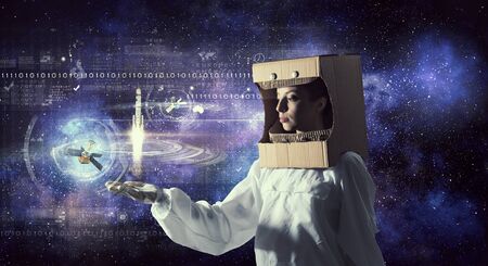 Young woman with carton box on head imagine she is astronaut. Elements of this image are furnished by NASA