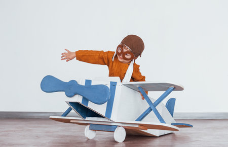 Little boy in retro pilot uniform having fun with toy plane indoors