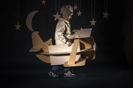 Boy is playing with handmade toy plane. Background – decorations of night sky