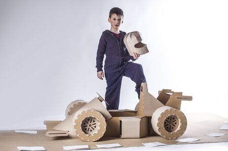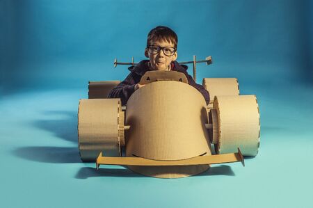 photo of young racer in glasses on a cardboard racing car on blue background
