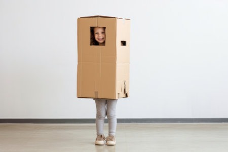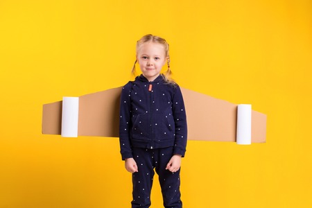 A little child girl is wearing homemade cardboard flying wings, pretending to be a pilot for a craft, imagination or exploration concept.