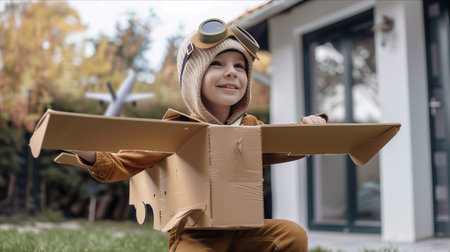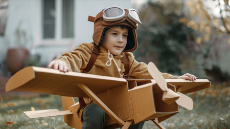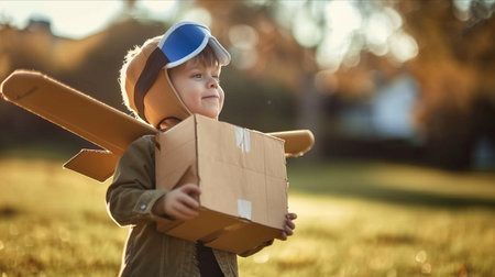A kid in a leather jacket and aviator's helmet playing in a field with a cardboard plane. Sunny day. Children's games and dreams.