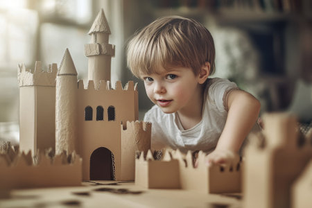 Young child engages in creative play with a large cardboard castle, focusing intently on building details.