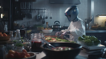 The AI chef is preparing a delicious meal. He is using fresh ingredients and state-of-the-art technology to create a truly unique culinary experience.