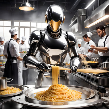 Robotic Chefs Preparing Gourmet Dishes in Kitchen