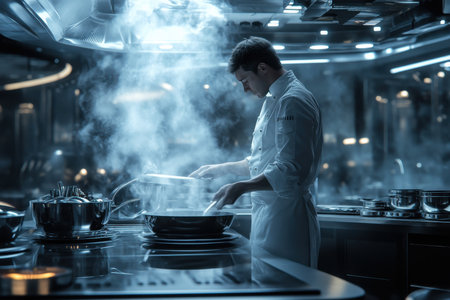 A chef skillfully prepares a gourmet dish, enhancing its elegance with digital effects. The interplay of technology and culinary art creates a mesmerizing dining experience.