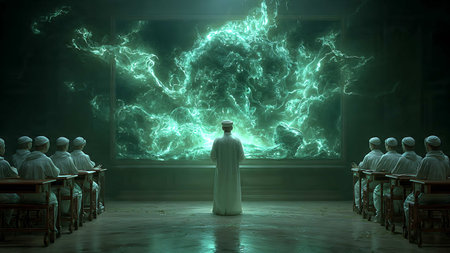 Diverse students and teacher examine holographic projections of ancient civilizations in a...