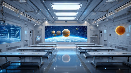 Innovative learning environment with students engaging in holographic science studies and a futuristic cityscape view