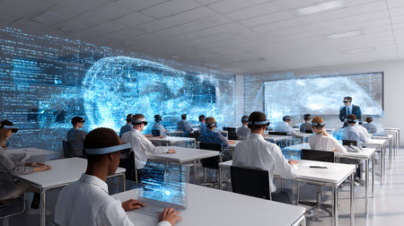 Futuristic classroom with students wearing VR headsets learning with holograms from instructor.