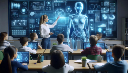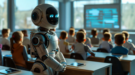 Children are engaged in learning as a robot presents information on a screen in a bright classroom.