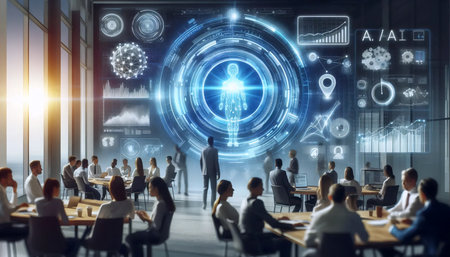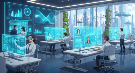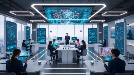 Professionals collaborating and learning in a futuristic smart office with holographic interfaces