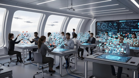 Diverse professionals and students engage with advanced holographic technology in a futuristic learning environment