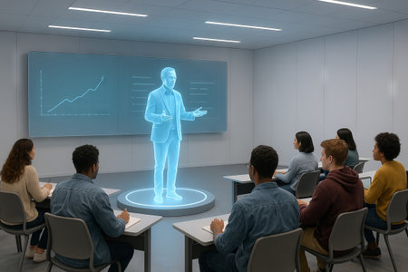 Virtual lecture featuring hologram with diverse students in modern classroom setting. concept of innovative education, technology in learning, interactive teaching.