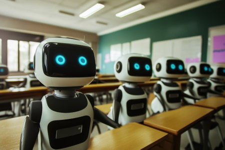 Robots are seated at desks in a classroom, engaged in a learning activity in a tech-savvy environment.